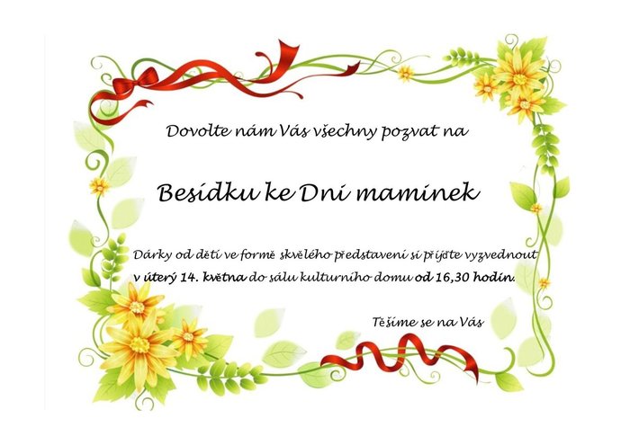 Děti z oddělení Žabiček, Berušek a žáci školy si pro Vás připravily pestré pásmo, kterým Vás chtějí potěšit  i pobavit. Ve spolupráci s obcí se můžete těšit na malé občerstvení.