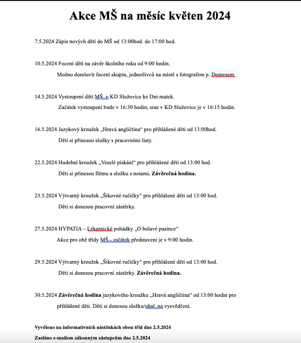 v přiloženém souboru se nachází přehled akcí mateřské školy na měsíc květen 2024.