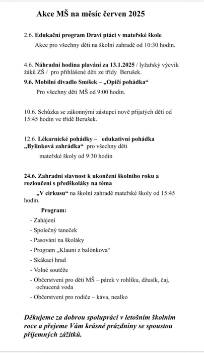 V přiloženém souboru Vám zasíláme již poslední přehled akcí mateřské školy v tomto školním roce.