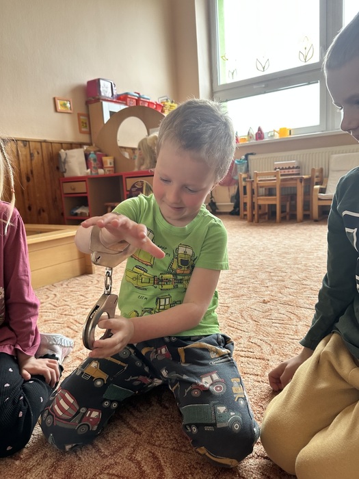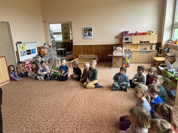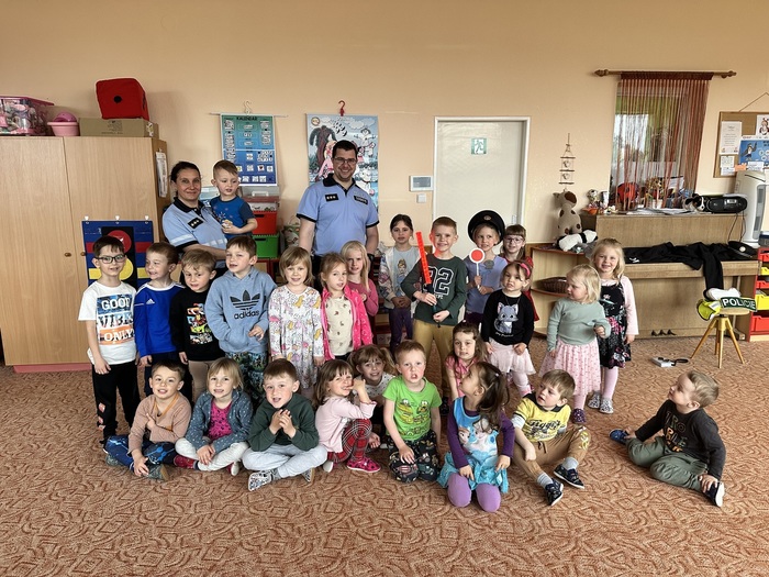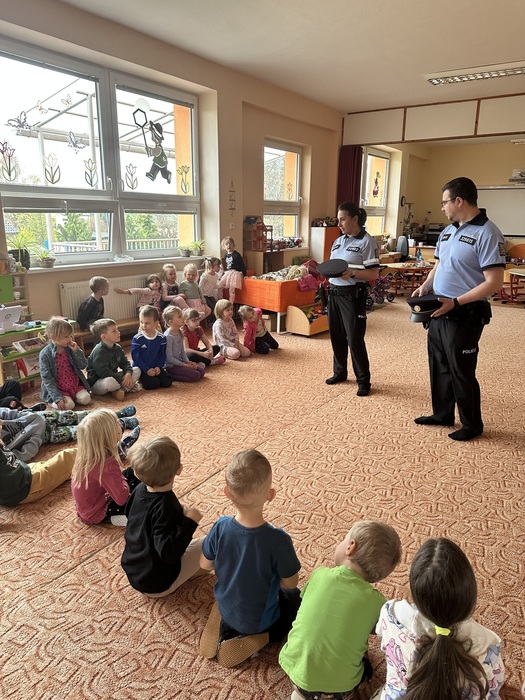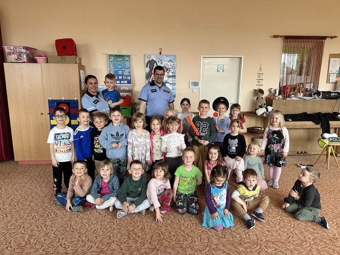 Ve čtvrtek 16.4. navštívili naší mateřskou školu policisté, kteří si pro děti připravili zajímavou a poučnou besedu o své práci. Seznámili děti s tím, co všechno policista dělá a jak pomáhá lidem. Součástí návštěvy byla také ukázka pomůcek a předmětů, které policisté při své práci používají. Děti si mohly některé z nich zblízka prohlédnout a také vyzkoušet. Velkým zážitkem byla prohlídka policejního vozu, do kterého si děti mohly sednout a seznámit se s jeho vybavením.